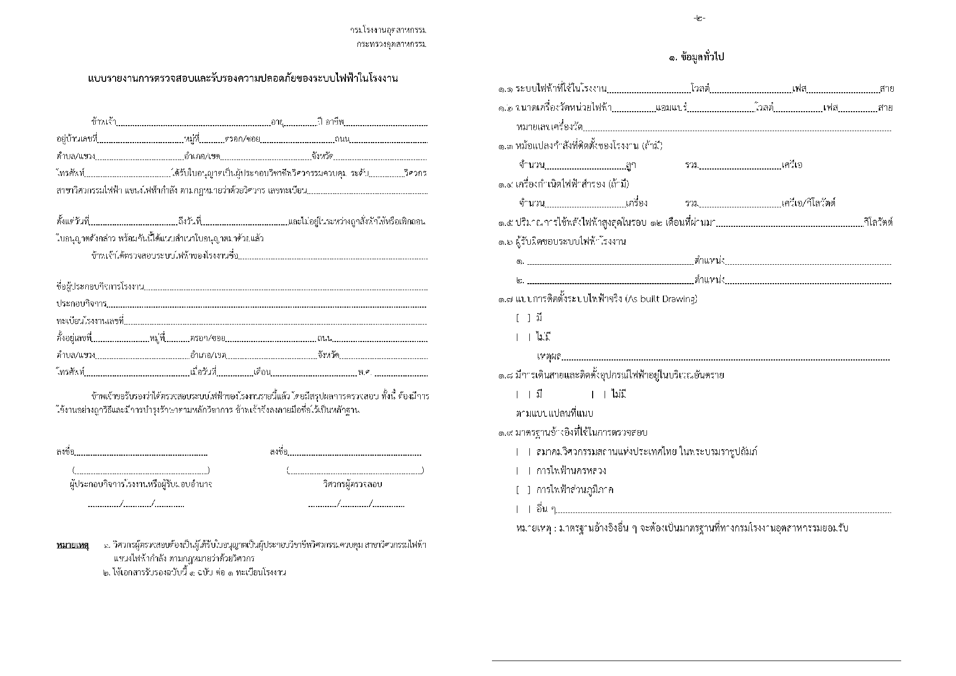 “ข้อ ๕ ผู้ประกอบกิจการโรงงานต้องจัดให้มีการตรวจสอบระบบไฟฟ้าในโรงงานและรับรอง ความปลอดภัยของระบบไฟฟ้าในโรงงานเป็นประจําทุกปีโดยวิศวกรหรือบุคคลอื่นที่รัฐมนตรีกําหนด โดยประกาศในราชกิจจานุเบกษา โดยการตรวจสอบและรับรองดังกล่าวต้องจัดให้มีเอกสารเป็นหลักฐาน การจัดให้มีเอกสารตามวรรคหนึ่งให้เป็นไปตามหลักเกณฑ์วิธีการ และเงื่อนไขที่รัฐมนตรีกําหนด โดยประกาศในราชกิจจานุเบกษา ในกรณีที่มีเหตุอันควร รัฐมนตรีจะประกาศในราชกิจจานุเบกษากําหนดหลักเกณฑ์และวิธีการ ตรวจสอบระบบไฟฟ้าในโรงงานและรับรองความปลอดภัยของระบบไฟฟ้าในโรงงานตามวรรคหนึ่งก็ได้ การตรวจสอบระบบไฟฟ้าในโรงงานและรับรองความปลอดภัยของระบบไฟฟ้าในโรงงาน ที่จัดอยู่ในประเภทอาคารที่ต้องจัดให้ มีผู้ตรวจสอบตามกฎหมายว่าด้วยการควบคุมอาคารให้เป็นไป ตามกฎหมายว่าด้วยการนั้นและให้ ถือว่าผู้ประกอบกิจการโรงงานที่ได้จัดให้ มีผู้ตรวจสอบนั้นได้ ดําเนินการ ตามวรรคหนึ่งแล้ว