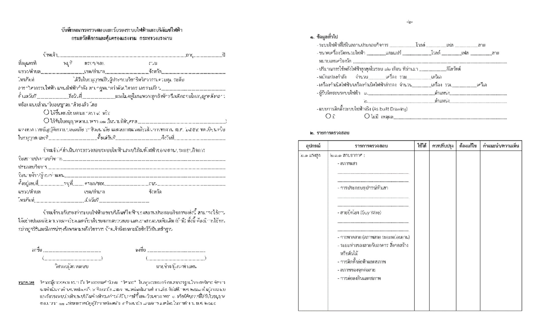 ข้อ ๒ ให้นายจ้างจัดให้มีการตรวจสอบและจัดให้มีการบํารุงรักษาระบบไฟฟ้าและบริภัณฑ์ไฟฟ้าของสถานประกอบกิจการเพื่อให้ใช้งานได้อย่างปลอดภัยอย่างน้อยปีละหนึ่งครั้ง และจัดทําบันทึกผลการตรวจสอบและรับรองระบบไฟฟ้าและบริภัณฑ์ไฟฟ้า ตามแบบท้ายประกาศนี้